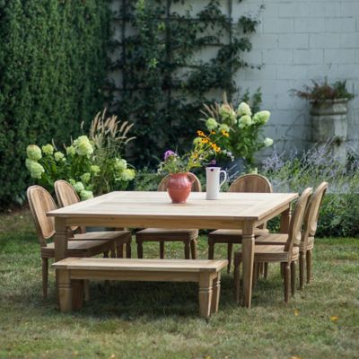 A ready-to-assemble teak dining table used in the construction skill. A teak dining bench. V d e.
